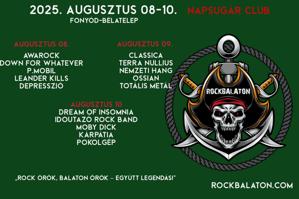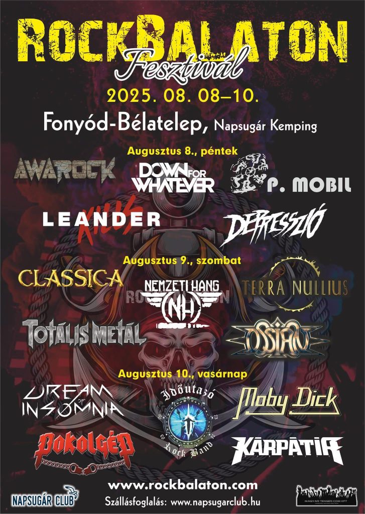 Rockbalaton Fesztivál: 2025.08.08-10, Fonyód, Bélatelep – Napsugár kemping. Posted on augusztus 1, 2025augusztus 1, 2025 / by Rattle A.D. / 2014-óta rendezik meg a Rockbalatont Fonyódon, így az idei év sem kivétel. Jegyek, bővebb infók az alábbi linken. https://rockbalaton.com/